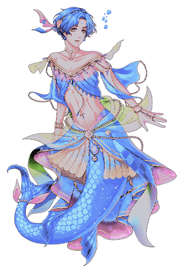 Written AppearanceHair is rather wavy and short, having longer bangs that are on either side of his face and leave his forehead exposed. Forehead has a small diamond right in the middle, this diamond is the mark that the merpeople of his kingdom get once they reach mastery and full control over their water based magic. Skin has a very peachy hue to it, blue scales popping up on here and there on his body like his shoulders have some. Eyes are a bright amber in color, like a hidden ocean jewel. Ears are pointed like most other merpeople. His bellybutton is pierced and the piercing is always present on his form. His tail is as blue as his hair and very shimmery, in the right lighting there's a kind of rainbow sheen to it. Fiske is often seen wearing a good amount of Jewelry. If he is ever using his "Land Legs" then he is seen wearing a necklace with a bright amber jewel, there is magic in the necklace that allows him to have human legs and walk amongst humans.